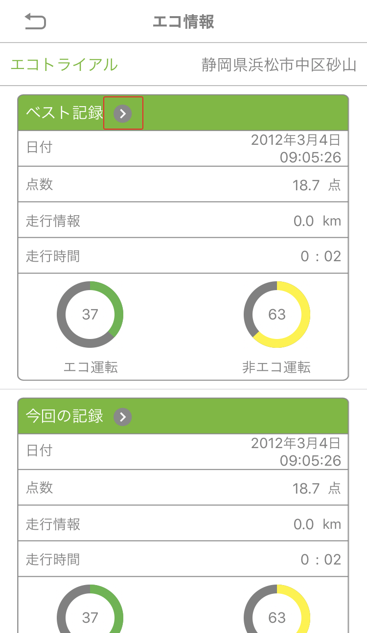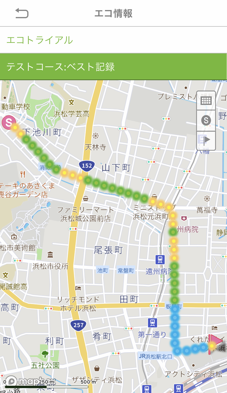 ボタンを押すと、地図にエコ運転の結果が表示されます。